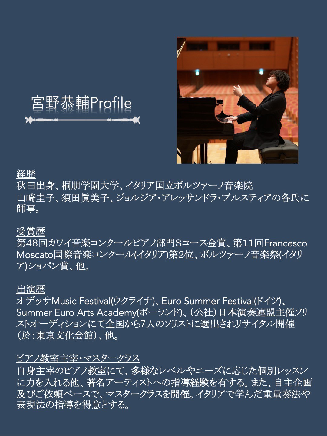 これまでの自分とは一味違う演奏を目指す方へ、ピアニスト宮野恭輔が全力でレッスンさせていただきます。