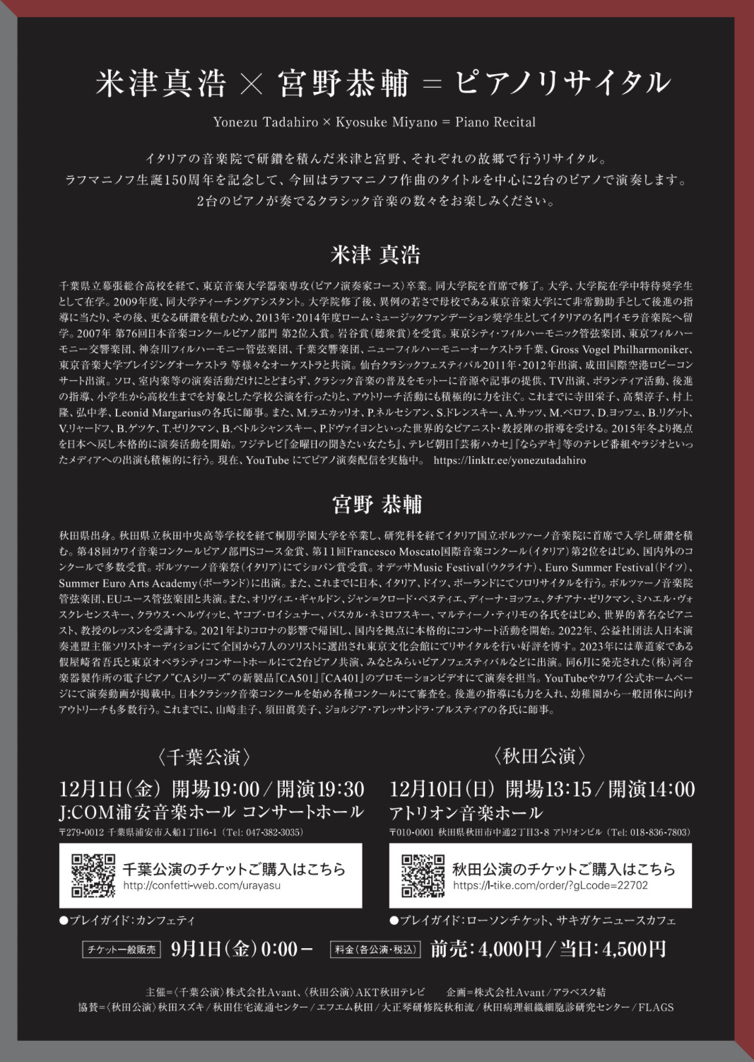 ピアニスト米津真浩さんと2台ピアノコンサートをお互いの地元千葉県と秋田県の素晴らしいホールで行います!