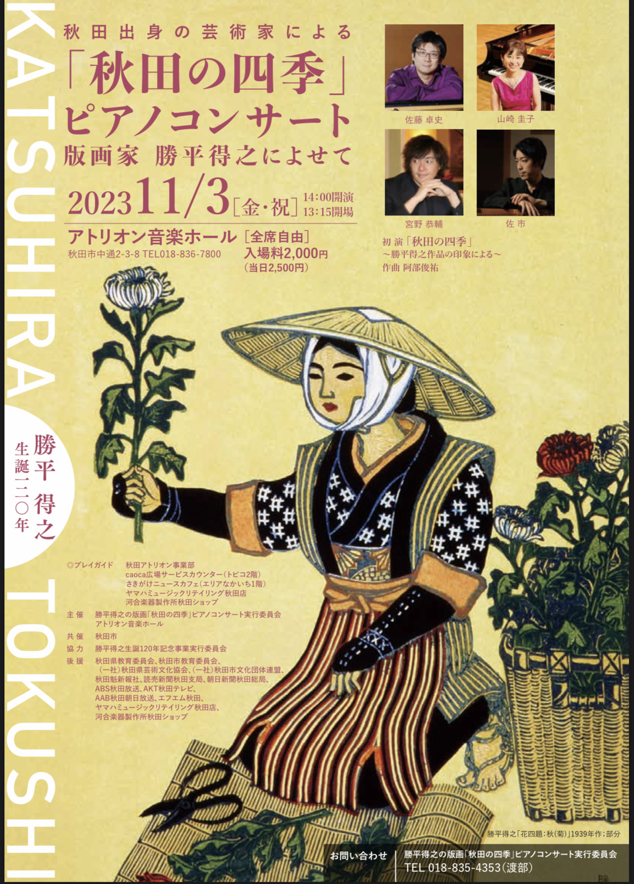 秋田出身の版画家勝平得之の生誕120周年を記念して、勝平得之研究科と秋田出身のピアニスト・作曲家によるコラボコンサートが行われます。こちらのコンサートのピアニストに選抜していただき、僕は第一部の『2台ピアノで巡る世界の風景』と、第三部の『4台ピアノで紡ぐ詩の国秋田』に出演します。僕はドビュッシーとラフマニノフ、秋田の音楽『浜辺の歌』と『ドンパン節』を佐藤卓史さんと佐市さんの編曲版を演奏します。
