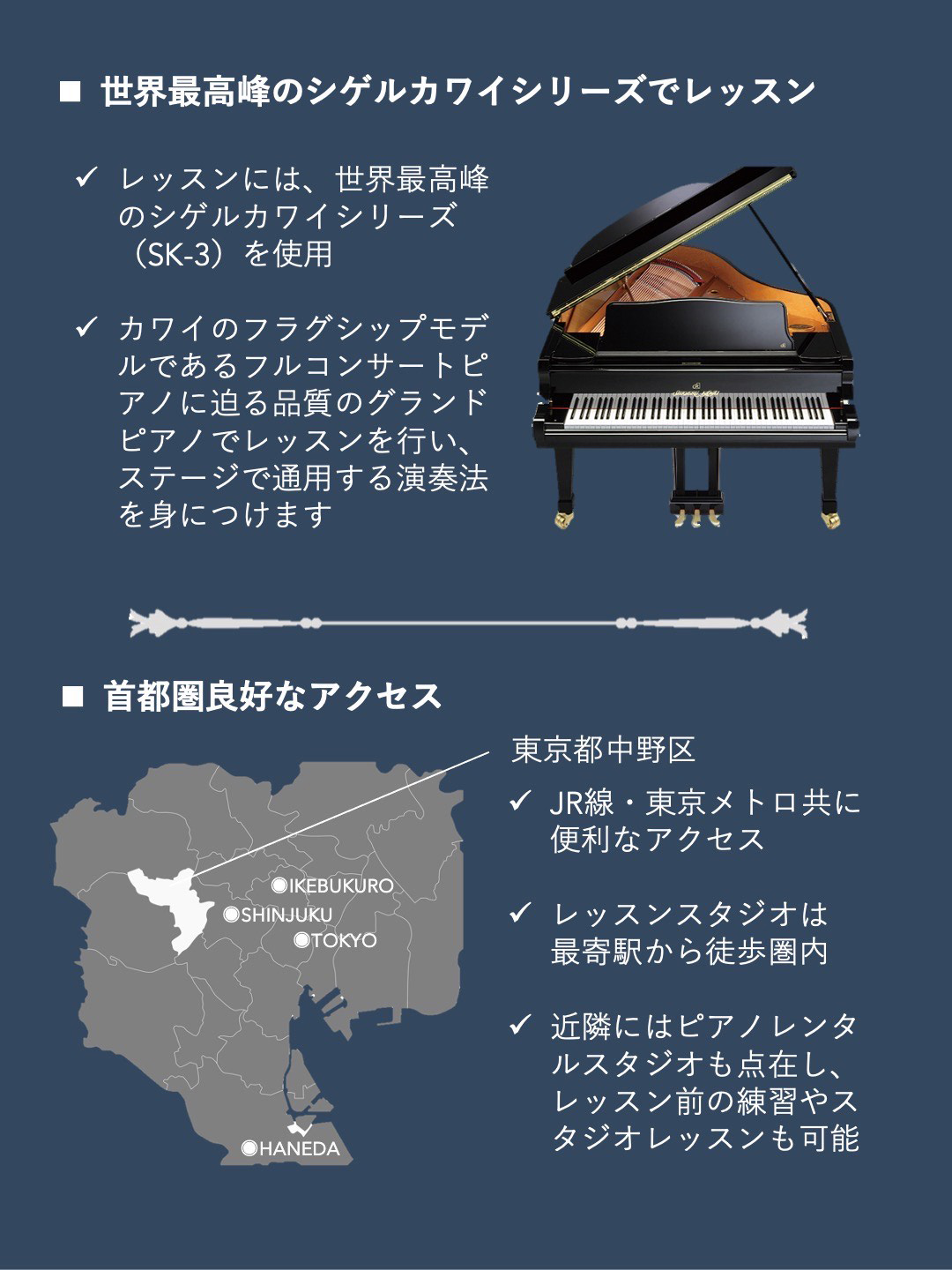 東京池袋駅から約20分のアクセスの良い場所で、秋田から拠点を関東に移し演奏活動とご指導に力を注いでおります。