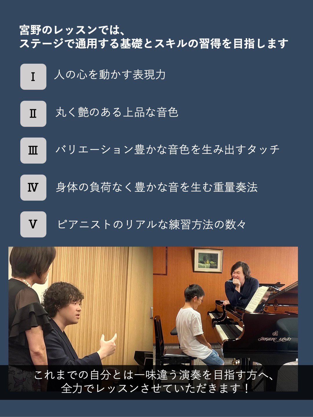 これまでの自分とは一味違う演奏を目指す方へ、ピアニスト宮野恭輔が全力でレッスンさせていただきます。