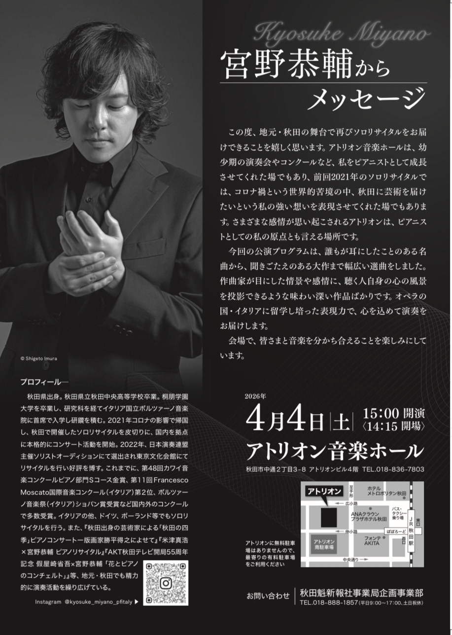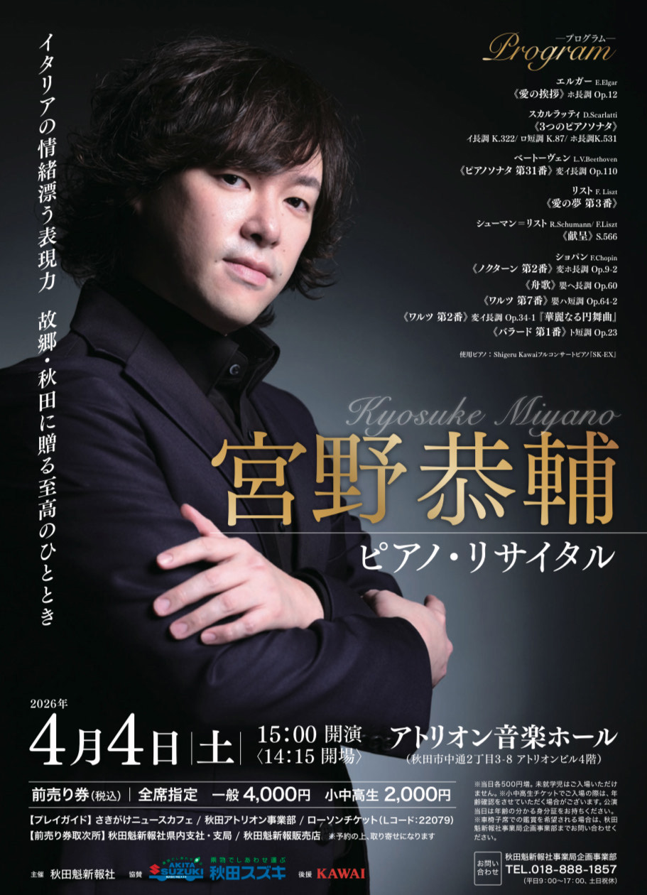 2026年4月4日(土) 秋田アトリオン音楽ホールにてソロリサイタル開催決定‼️